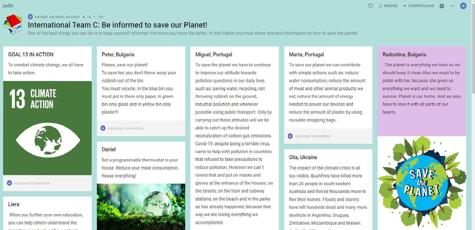 O projeto eTwinning "We read, we learn, we know!", já anteriormente reconhecido pelo Plano Nacional de Leitura como exemplo de Boa Prática no âmbito da Leitura, Escrita e Tecnologias Digiatis, visou consolidar hábitos de leitura e a compreensão leitora, através do trabalho articulado e colaborativo entre a Bibliotecas Escolar e os “Professores de Sala de Aula”, e suscitar, simultaneamente, a tomada de consciência/compromisso dos alunos em relação a si próprios, à comunidade e ao planeta. Teve como objetivos, ainda, desenvolver o gosto pela partilha de experiências de leitura diversificadas, incluindo de leitura para acesso à informação, em diferentes suportes, neste caso fundamentalmente associada à temática das alterações climáticas e proteção ambiental, associar o prazer/benefício da leitura ao desenvolvimento do espírito crítico, à capacidade de emitir opinião e de intervir no mundo. Tratou-se de um projeto interdisciplinar desenvolvido por professores e alunos da Bulgária, Grécia, Portugal e Ucrânia, que, no que concerne ao nosso Agrupamento, juntou Professoras Bibliotecárias, de Língua Materna e Estrangeira, de CN e de Geografia. Nele estiveram envolvidas duas turmas, a saber: o 7.ºB da Escola Básica de Baltar e o 8.º E da Escola Secundária Daniel Faria. Pode ser consultado aqui, embora nem todas as páginas sejam públicas: https://twinspace.etwinning.net/108903/home.